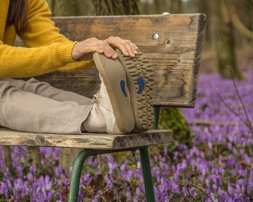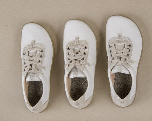 They are shaped like feet. The forefoot part forms a shoe wide enough for us to step with the whole soles of the feet on the ground and all toes have enough space to spread and move. Particular attention is paid to the front inner curve of the shoes, which should provide ample space for the toes, for the active gait.