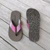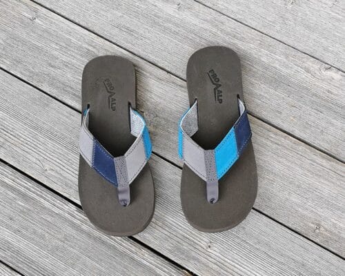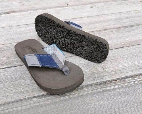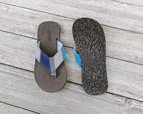 The Ocean thongs are soft, light, and skin-friendly. The upper part is entirely made of leather, and the felt and cotton fabric are used for the lining. The sole consists of two parts. The upper part is softer, whereas the lower part is a little more compact, providing firmness to the thong. They are suitable for all-day wear, including for walking along a rocky sea coast. They are not suitable for water, because the leather hardens if it gets wet.